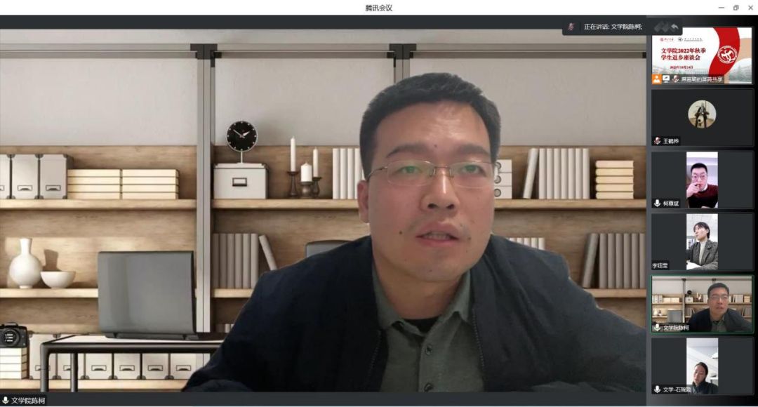 为进一步增进师生交流,帮助教师深入了解学生返乡后的思想状况,把握学生思想动态,同时畅通学生信息反馈渠道,常态化长效化推进党史学习教育“我为学生办实事”工作取得实效,10月14日下午,学院在线上召开了秋季学生返乡座谈会。院党委副书记陈柯,院长助理柯尊斌,院教务办公室、研究生工作办公室相关负责人,学院全体辅导员及本硕各年级学生代表共30人参加了座谈会。会议由院团委书记石琬璐主持。