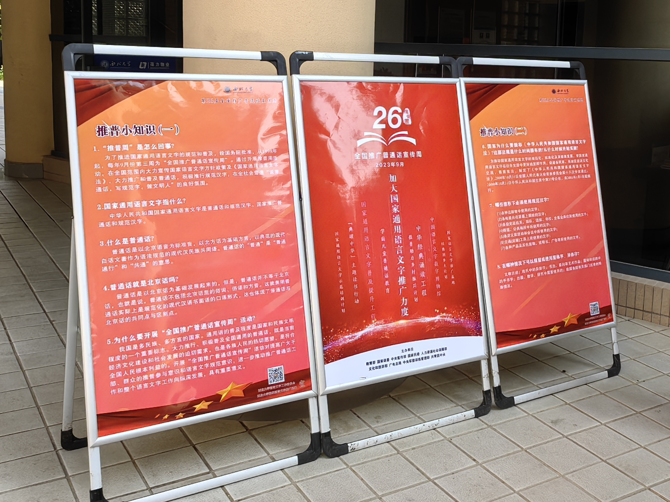 2023年9月11日,西北大学第26届全国推广普通话宣传周活动顺利启动。本次活动由西北大学语言文字工作委员会主办,西北大学国家语言文字推广基地承办。活动以习近平新时代中国特色社会主义思想为指导,深入宣传贯彻党的二十大精神和习近平总书记关于语言文化的重要指示批示精神,以落实立德树人根本任务和服务铸牢中华民族共同体意识为主线,继续在学校及周边地区大力推广国家通用语言文字,传承弘扬中华优秀语言文化,营造学习和使用国家通用语言文字的氛围,助力新时代国家语言文字事业高质量发展。